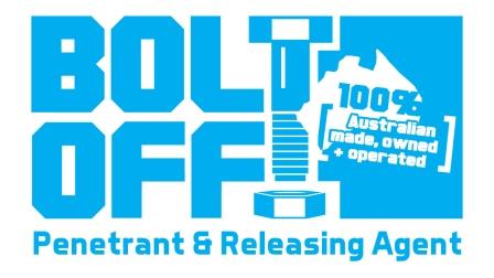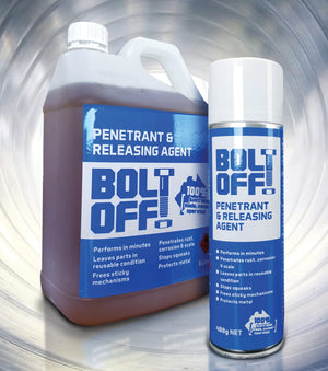 BOLT OFF Penetrant & Releasing AgentĀ Formulated to permeate through rusty and frozen metal parts. Fast acting and slow to evaporate. Lubricates and prevents further corrosive action. Suitable on all metal parts where corrosion or rust occurs. Made in Australia.