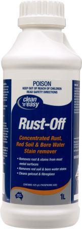 Clean 'n' Easy Rust-Off Rust Stain Remover removes rust and stains from rusted metal surfaces. May be used on chrome, stainless steel, alloy, wrought iron, fibreglass, rubber, and painted timber. Use for etching concrete and new galvanised surfaces prior to over coat. Useful for removing red soil and bore water stains from concrete and terrazzo tiles.