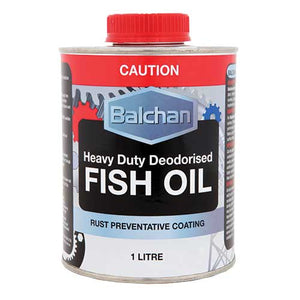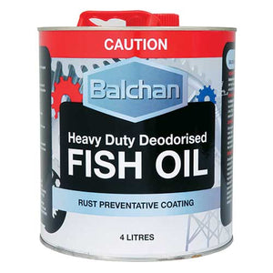 Balchan Heavy Duty Deodorised Fish Oil Specially blended anti-corrosive clear finish rust preventative. Ideal for inaccessible places such as door cavities, crevices, joints, cracks, door, window and gate fittings, wrought iron, nuts and bolts. Use in automotive, marine and household. Can be applied by brush, roller or spray. Proper surface preparation is essential.