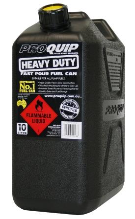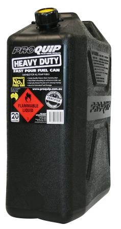 Pro Quip Heavy Duty Plastic Fuel Cans Certified to AS2906:2001 Australian Made. Thicker black resin moulding allowing for heavy duty usage and is ideal for extended fuel storage. Suitable for unleaded, diesel and all pump fuels. Military style for easy fit into racking. Integrated top handle. Internally stored pourer. Breather at back ensures contents pour freely. Embossed finish provides slip resistance. Replacement interchangeable parts available in retail packaging.