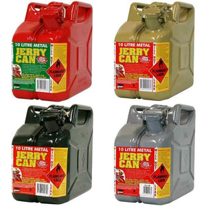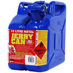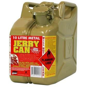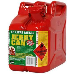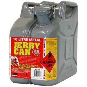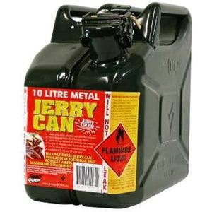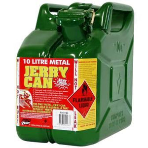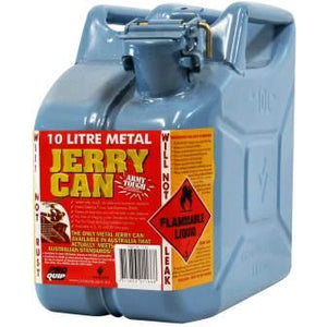 Pro Quip Metal Jerry Cans 10 litre All Pro Quip metal Jerry cans are certified to AS2906:2001, and pass Defence Force testing (BAM). Designed with dual bayonet closure with patented secondary locking pin. Pressure tested to 415kpa. Designed with 12mm square internal breather pipe into ullage to ensure contents pour freely. Meet UN approval and meet TUV Standards.