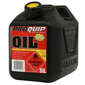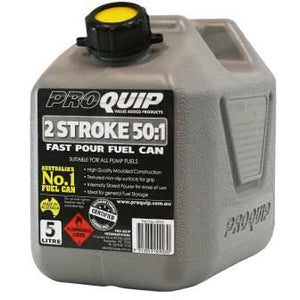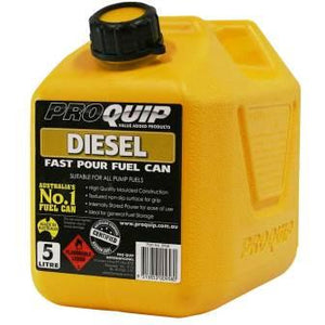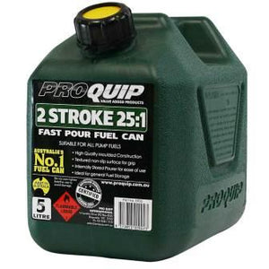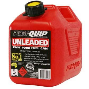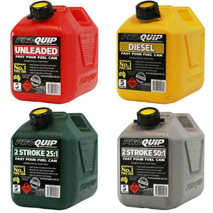 Pro Quip Plastic Fuel Cans 5 Litre Certified to AS2906:2001 Australian Made. Military style for easy fit into racking. Integrated top handle. Internally stored pourer. Breather at back ensures contents pour freely. Embossed finish provides slip resistance. Replacement interchangeable parts available in retail packaging.