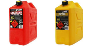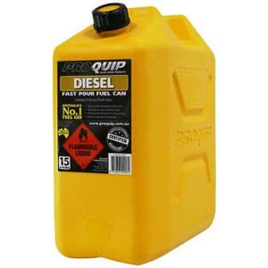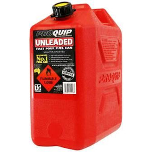 Pro Quip Plastic Fuel Cans 15 Litre Certified to AS2906:2001 Australian Made. Military style for easy fit into racking. Integrated top handle. Internally stored pourer. Breather at back ensures contents pour freely. Embossed finish provides slip resistance. Replacement interchangeable parts available in retail packaging.