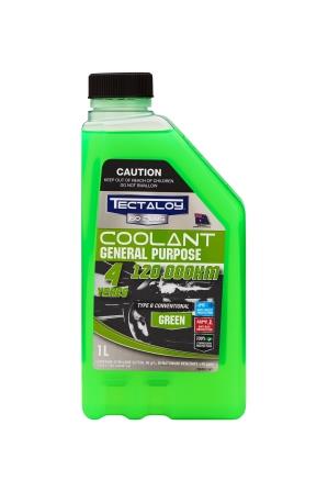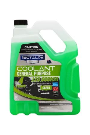 Tectaloy General Purpose Coolant Pre-mixed Ready-to-use radiator coolant, Conventional Type. Suited to earlier model vehicles. For use in normal passenger vehicles under normal driving conditions. 65gm/litre ethylene glycol. 4 years 120,000kms. -2C anti-freeze, +122C anti-boil.